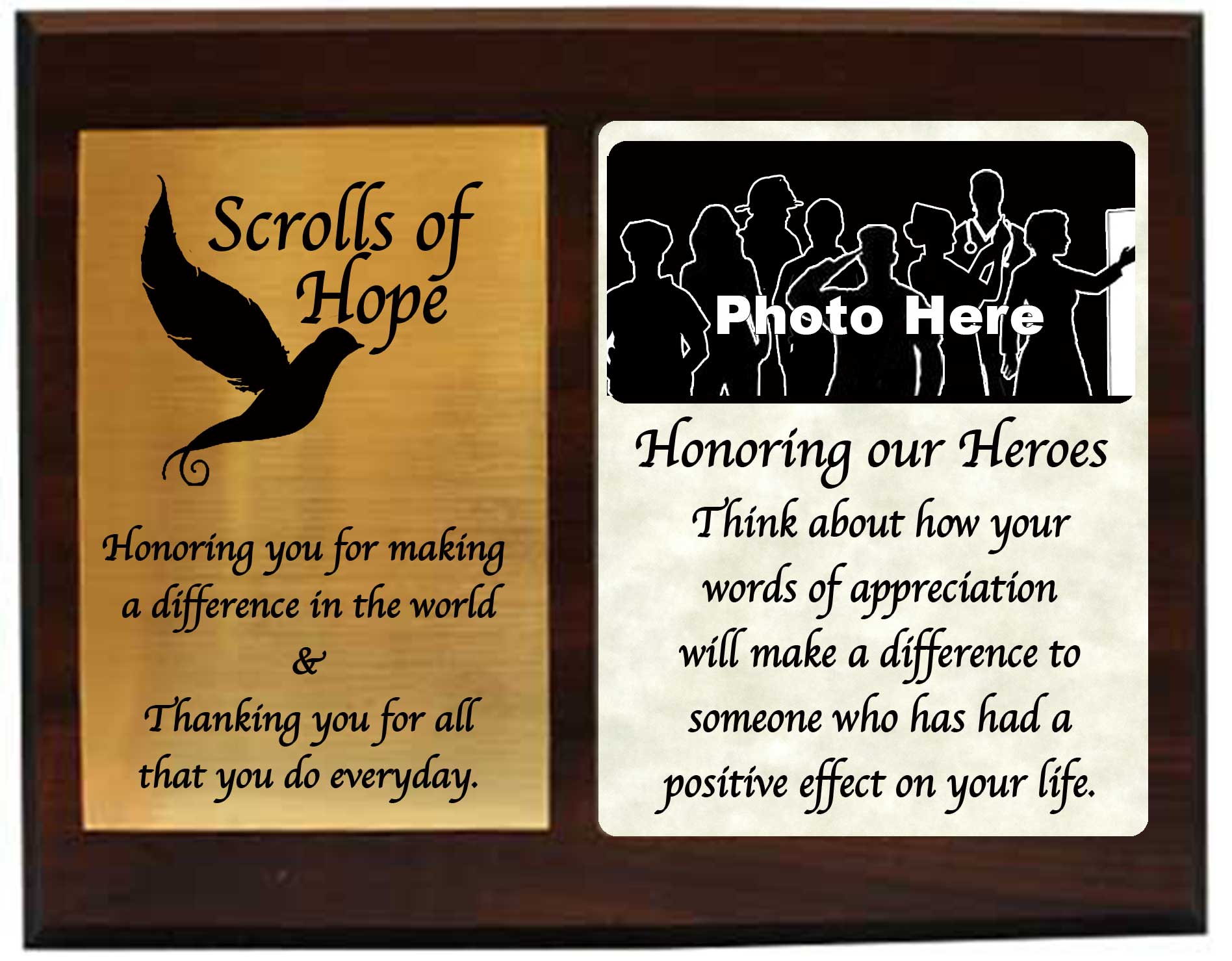 Send us your heroes. Tell us what they have done for you or our community. We will create a digital Plaque of Appreciation to honor them and their good deeds for free. To acknowledge and show gratitude for our everyday heroes, Scrolls of Hope will gratuitously share each Plaque of Appreciation through social media to be shared and enjoyed by all.